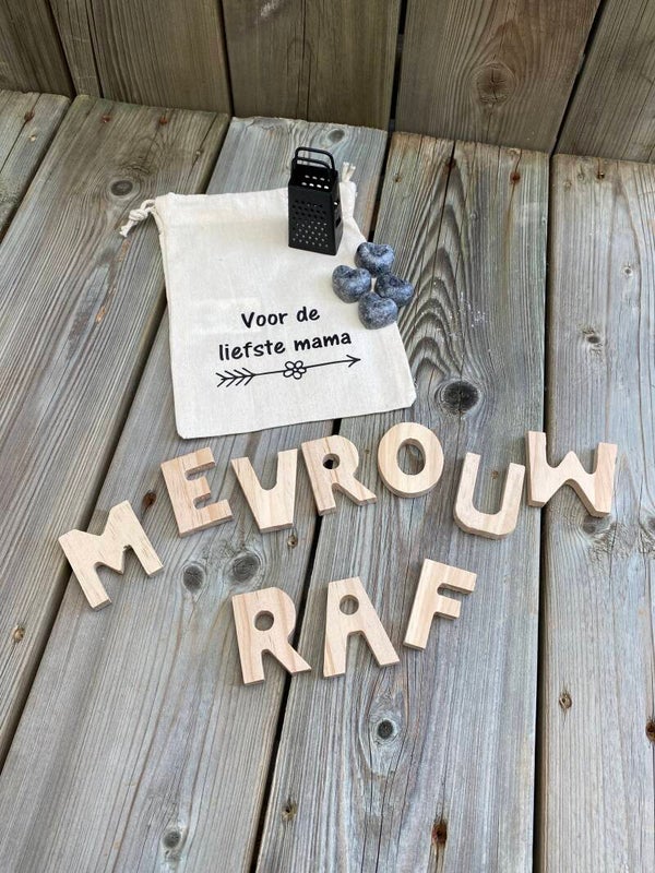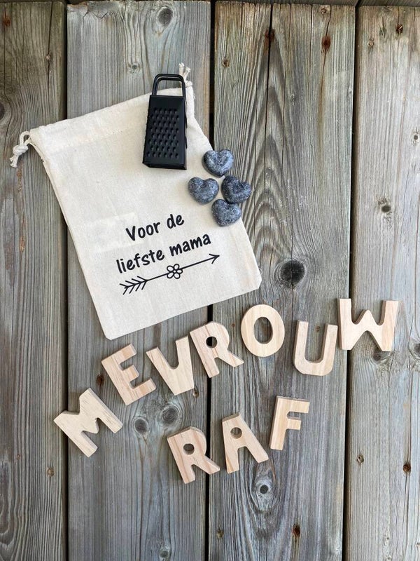 Cadeauzakje ''voor de liefste mama'' + rasp en 4 hartjes amber
